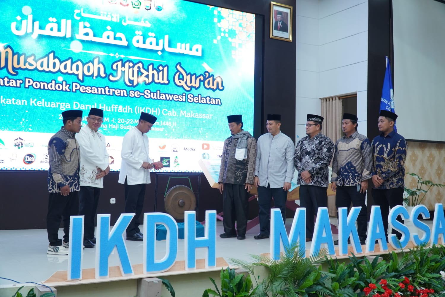 Plh Sekda Provinsi Sulawesi Selatan didampingi pimpinan pondok pesantren Darul Huffadh, perwakilan Walokota Makassar, dan utusan Kemenag Pronvinsi menabuh gong sebagai tanda dibukanya MHQ antar pondok pesantren Se-Sulawesi Selatan dan diakhiri dengan sesi Foto bersama.