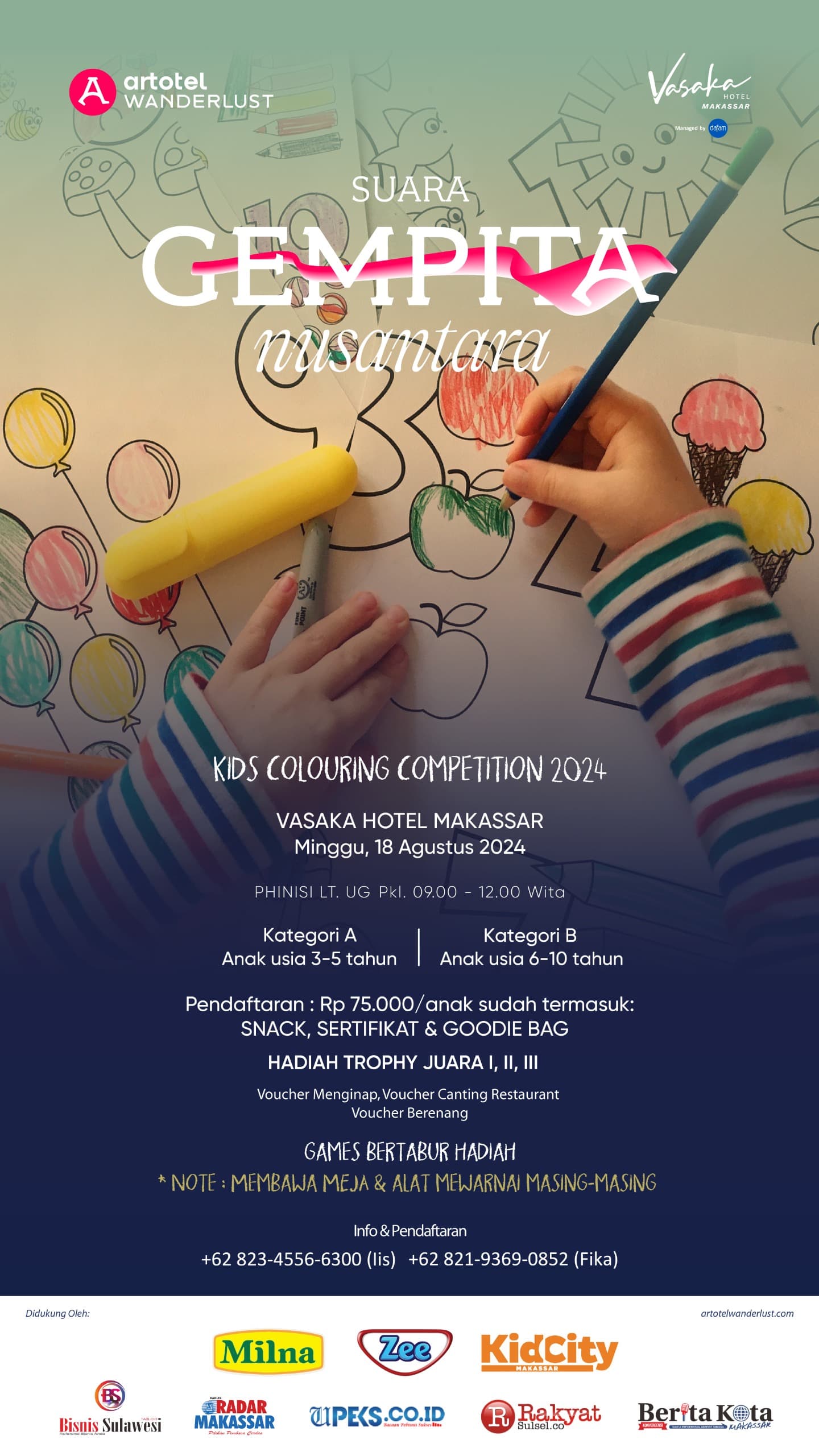 Kemeriahan juga semakin terasa dengan program Suara Nusantara, yaitu kegiatan menarik yang dihadirkan berupa penampilan musisi lokal; band atau DJ, hingga beragam kegiatan creative workshop dan olahraga yang dilaksanakan tepat pada tanggal 17 Agustus 2024. Dalam program Suara Nusantara ini, Vasaka Makassar akan menghadirkan beberapa kegiatan diantaranya Kids Colouring Competition 2024 yang terbagi menjadi 2 kategori yaitu Kategori A (3-5 tahun) dan Kategori B (6-10 tahun). Biaya pendaftaran Rp.75.000 per Anak sudah termasuk : Snack, Sertifikat & Goodie bag. Kegiatan ini akan dilakukan pada hari Minggu tanggal 18 Agustus 2024. Untuk pendaftaran kegiatan Kids Colouring Competition, dapat menghubungi nomor +62 823 4556 6300 (iis).