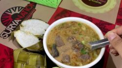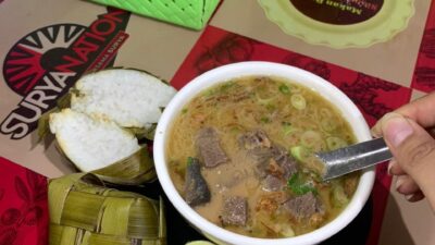 Soto Betawi, Soto Betawi khas Jakarta dengan kuah santan, susu, isian daging sapi disajikan dengan nasi putih dan emping, hanya dengan harga Rp. 40.000 per porsi.
