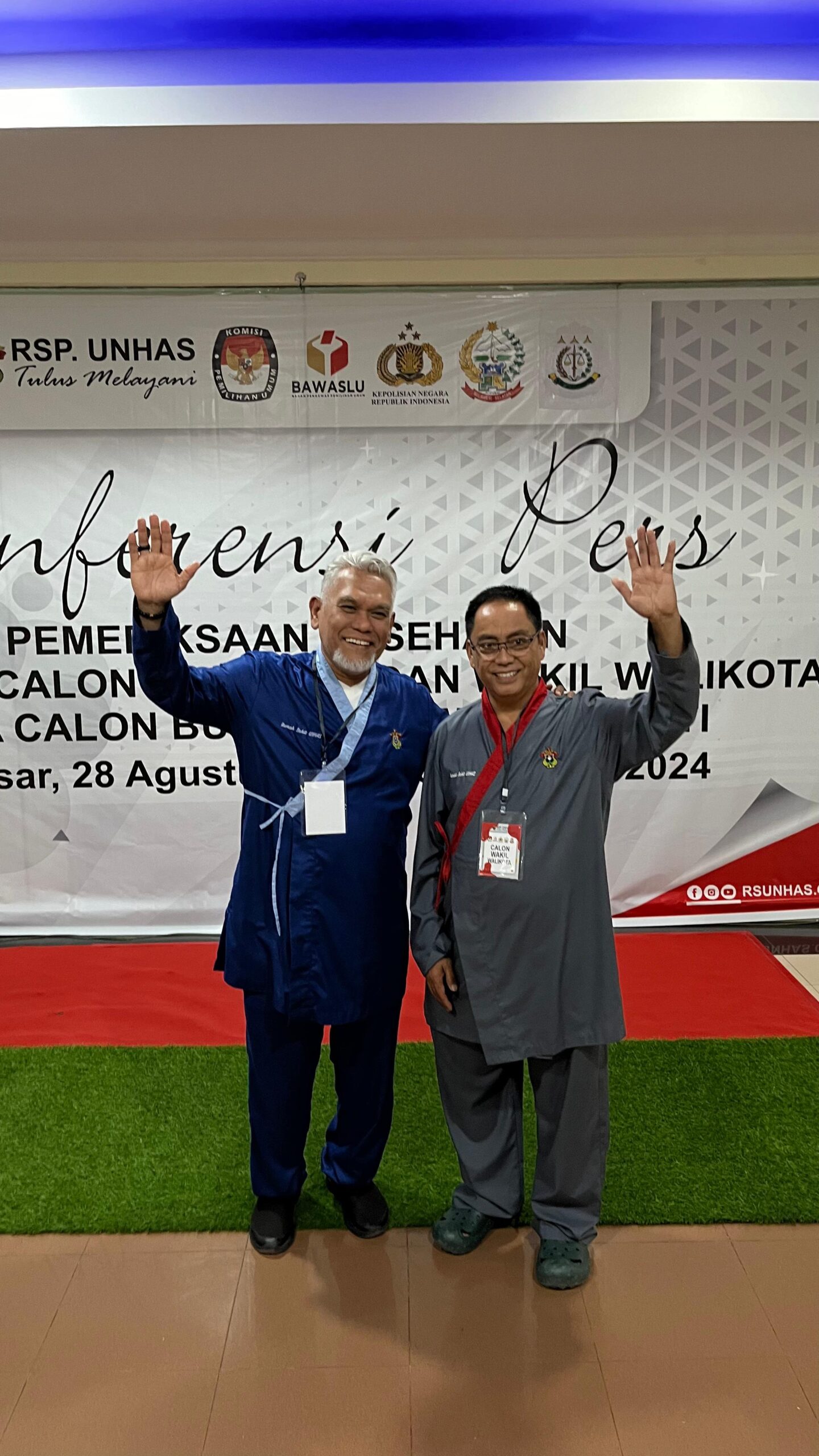 Pasangan bakal calon pada pilwalkot Makassar 2024, Amri Arsyid dan Rahman Bando mengikuti tes kesehatan di RS Universitas Hasanuddin, Senin (2/9/2024). Jadwal pemeriksaan pasangan calon ini berbeda, namun pagi itu sesampainya di RS ke duanya terlihat datang bersamaan memakai kostum coklat putih dan tidak menyangka bakal sekompak ini.