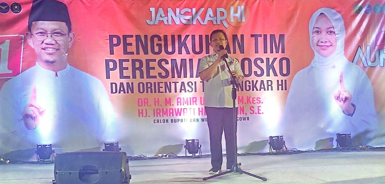 MAKASSAR,FILALIN.COM, — Pasangan calon Bupati dan Wakil Bupati Gowa, DR.H.M.Amir Uskara,M.Kes- Hj.Irmawati Haeruddin, SE ( AURAMA)   nomor urut 1 mengukuhkan Tim dan Peresmian Posko Tim  JANGKAR HI ( Jaringan Akar Rumput Hj.Irmawati Haeruddin, SE) serta orientasi Tim yang digelar di Kecamatan Bontomarannu, Kabupaten Gowa.