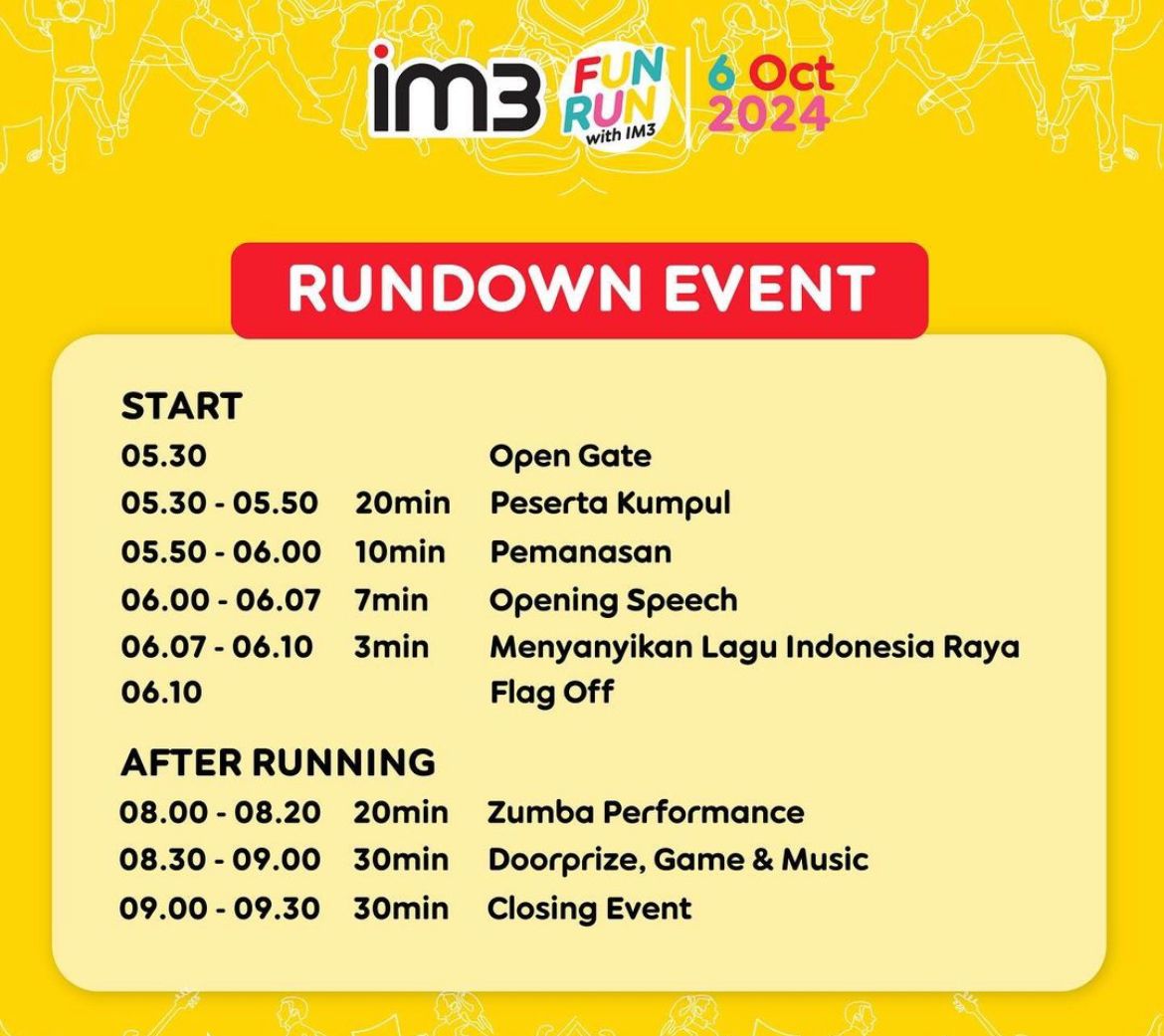 IM3 Fun Run akan star atau flag off pukul 06.10 wita sehingga para peserta harus berada di lokasi sebelum jam 06.pagi. Berdasarkan rundown acara dari penyelenggara, open gate jam 5.30 wita kemudian dilanjutkan dengan berkumpul para peserta dan pemanasan. Selanjutnya pukul 06.00-06.07 wita ada opening speech yang kemudian dilanjutkan dengan menyanyikan lagi indonesia raya dan flag off.