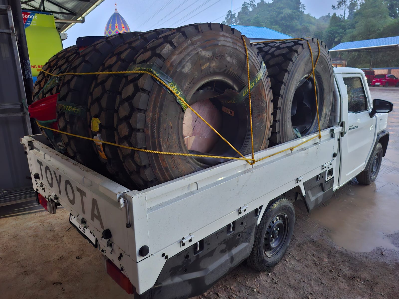 Medan yang dilalui Pak Yanto bukanlah jalan aspal mulus. Jalan menuju lokasi tambang didominasi oleh bebatuan, lumpur, dan tanah kering yang menantang. Namun, Hilux Rangga mampu melewatinya dengan mudah, membuktikan ketangguhannya sebagai kendaraan niaga yang dapat diandalkan. “Selain mengangkut drum oli, saya juga sering membawa aki dan ban truk berukuran besar. Kapasitas bak yang luas sangat memudahkan saya dalam mengatur dan mengangkut barang dalam jumlah banyak,” tambah Pak Yanto.