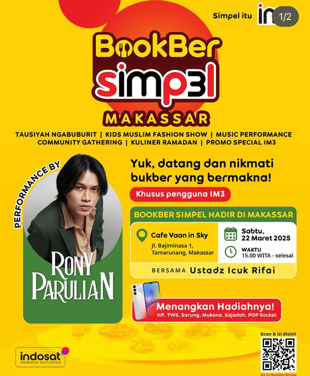 MAKASSAR,FILALIN.COM, — Indosat Ooredoo Hutchison melalui brand IM3 menggelar acara spesial Ramadan bertajuk “BookBer Simpel IM3” di Vaan in Sky, Jalan Bajiminasa, Makassar. Acara ini menghadirkan Rony Parulian, penyanyi jebolan Indonesian Idol musim ke-12, sebagai bintang tamu utama. Selain hiburan, BookBer Simpel IM3 juga menyuguhkan berbagai kegiatan menarik, seperti pembagian takjil gratis, tausiyah ngabuburit, fashion show anak Muslimah, serta community gathering. Kegiatan ini bertujuan untuk mempererat kebersamaan masyarakat Makassar selama bulan suci Ramadan.