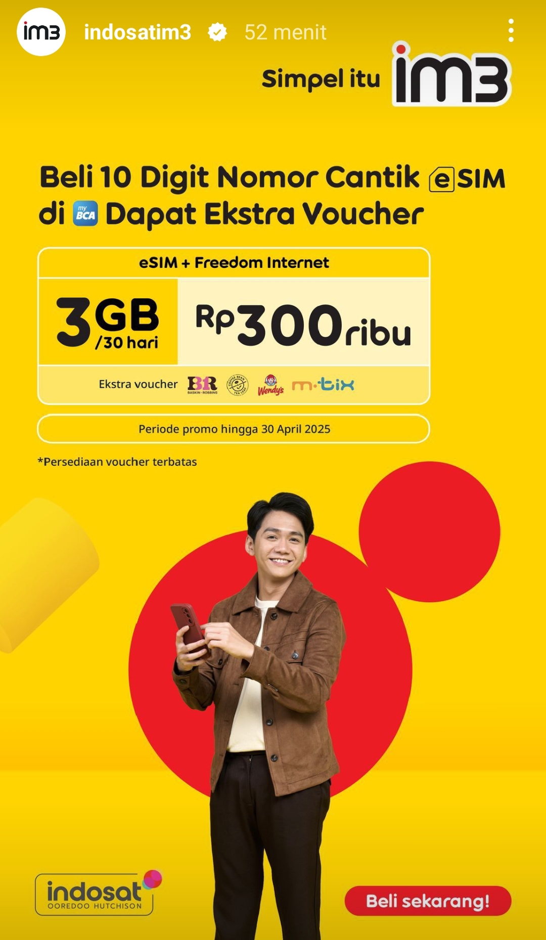 MAKASSAR,FILALIN.COM, –Indosat IM3 menghadirkan promo spesial bagi pelanggan yang membeli nomor cantik 10 digit eSIM melalui aplikasi myBCA. Dalam promo ini, pelanggan akan mendapatkan paket Freedom Internet sebesar 3GB untuk 30 hari senilai Rp300 ribu. Tak hanya itu, pelanggan juga berhak mendapatkan ekstra voucher dari beberapa merchant ternama seperti Baskin Robbins, Kopi Kenangan, Wendy’s, dan m-Tix. Promo ini berlaku hingga 30 April 2025 dengan jumlah voucher yang terbatas.
