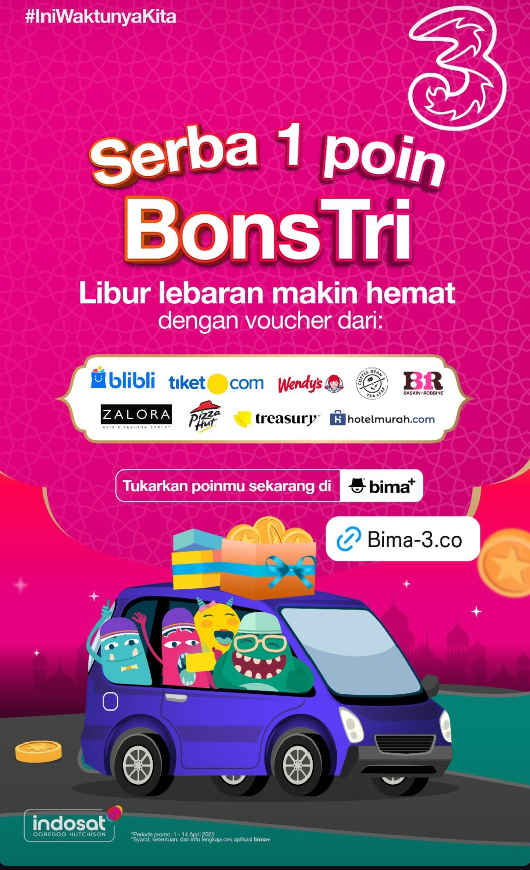 MAKASSAR,FILALIN.COM, — Operator seluler Tri menghadirkan promo spesial “Serba 1 Poin BonsTri” untuk menyambut libur Lebaran 2025. Dalam promo ini, pelanggan cukup menukar 1 poin BonsTri untuk mendapatkan berbagai voucher menarik. Program ini berlangsung mulai 1 hingga 14 April 2025. Penukaran poin dapat dilakukan melalui aplikasi bima+ atau situs resmi Bima-3.co.