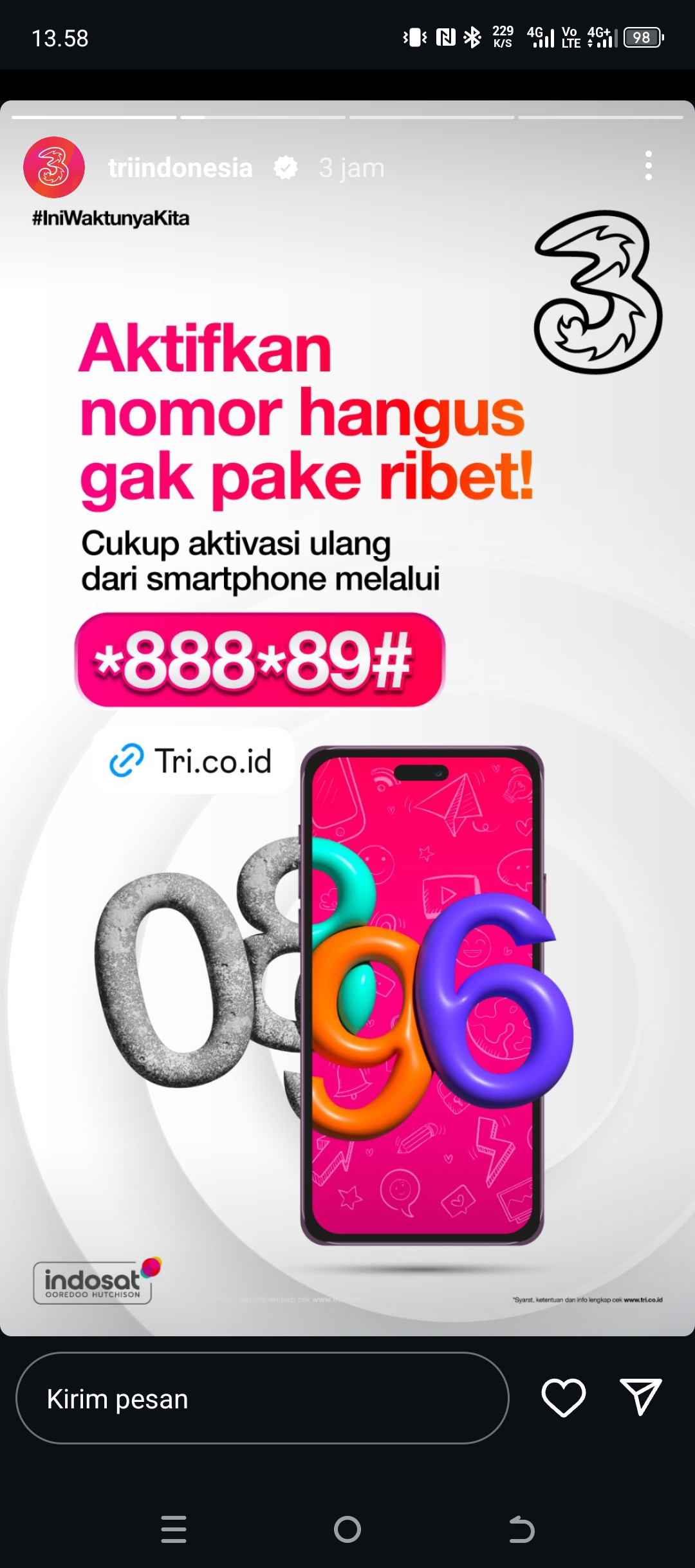 JAKARTA,FILALIN.COM, — Tri Indonesia menghadirkan solusi praktis bagi pelanggan yang ingin mengaktifkan kembali nomor hangus. Cukup dengan mengetikkan kode **888*89#** melalui smartphone, proses aktivasi ulang dapat dilakukan tanpa ribet. Langkah ini dinilai lebih efisien dibandingkan metode sebelumnya yang mengharuskan pelanggan mengunjungi gerai atau menghubungi layanan pelanggan. Dengan inovasi ini, Tri menunjukkan komitmennya dalam meningkatkan kenyamanan pengguna.