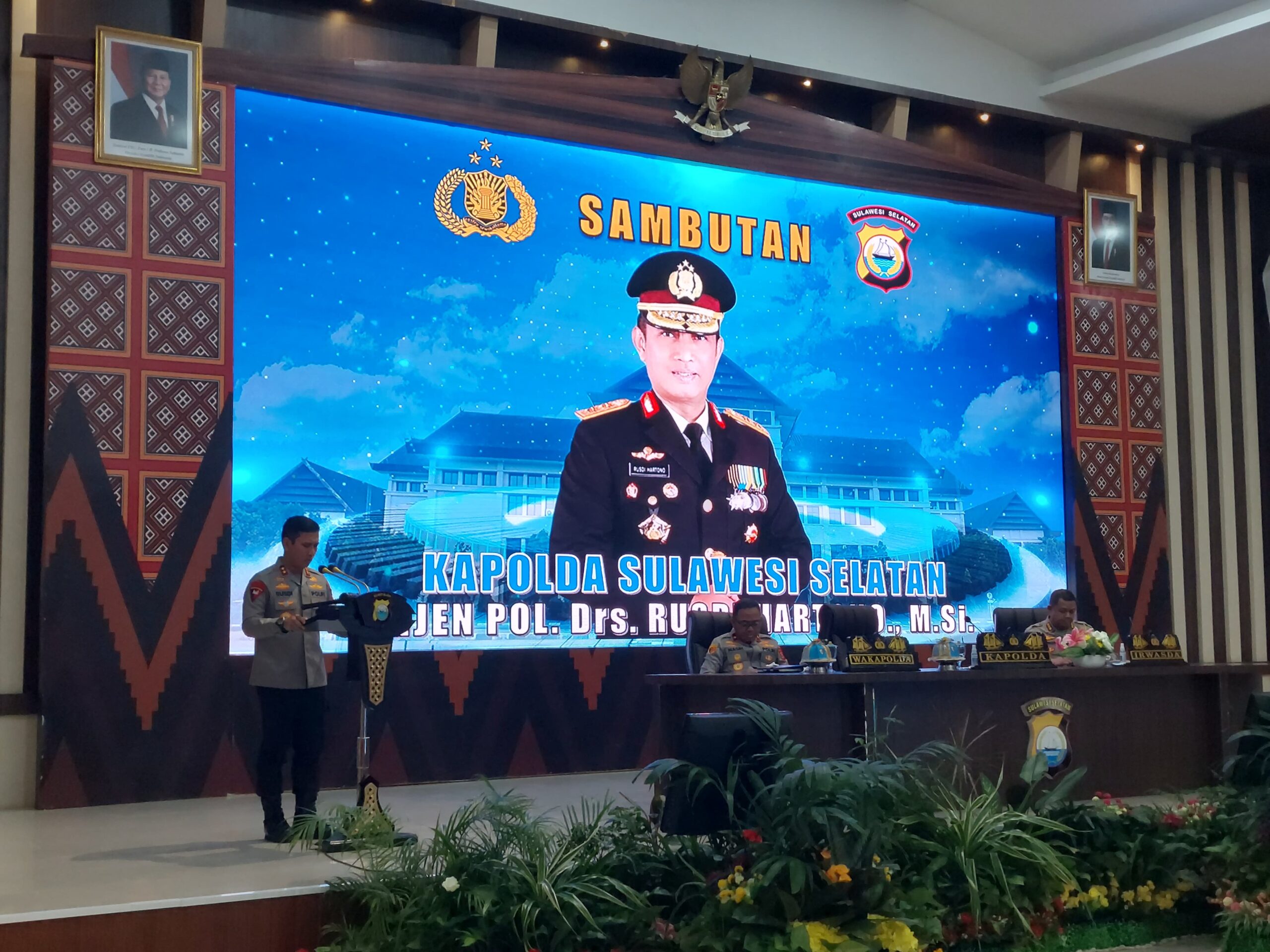 Kegiatan tersebut dihadiri oleh Kapolda Sulsel, IRJEN. POL. Drs. Rusdi Hartono, M.Si., Wakapolda Sulsel, BRIGJEN. POL. Nasri, S.I.K., M.H, serta para pejabat utama (PJU) Polda dan seluruh Kapolres jajaran.