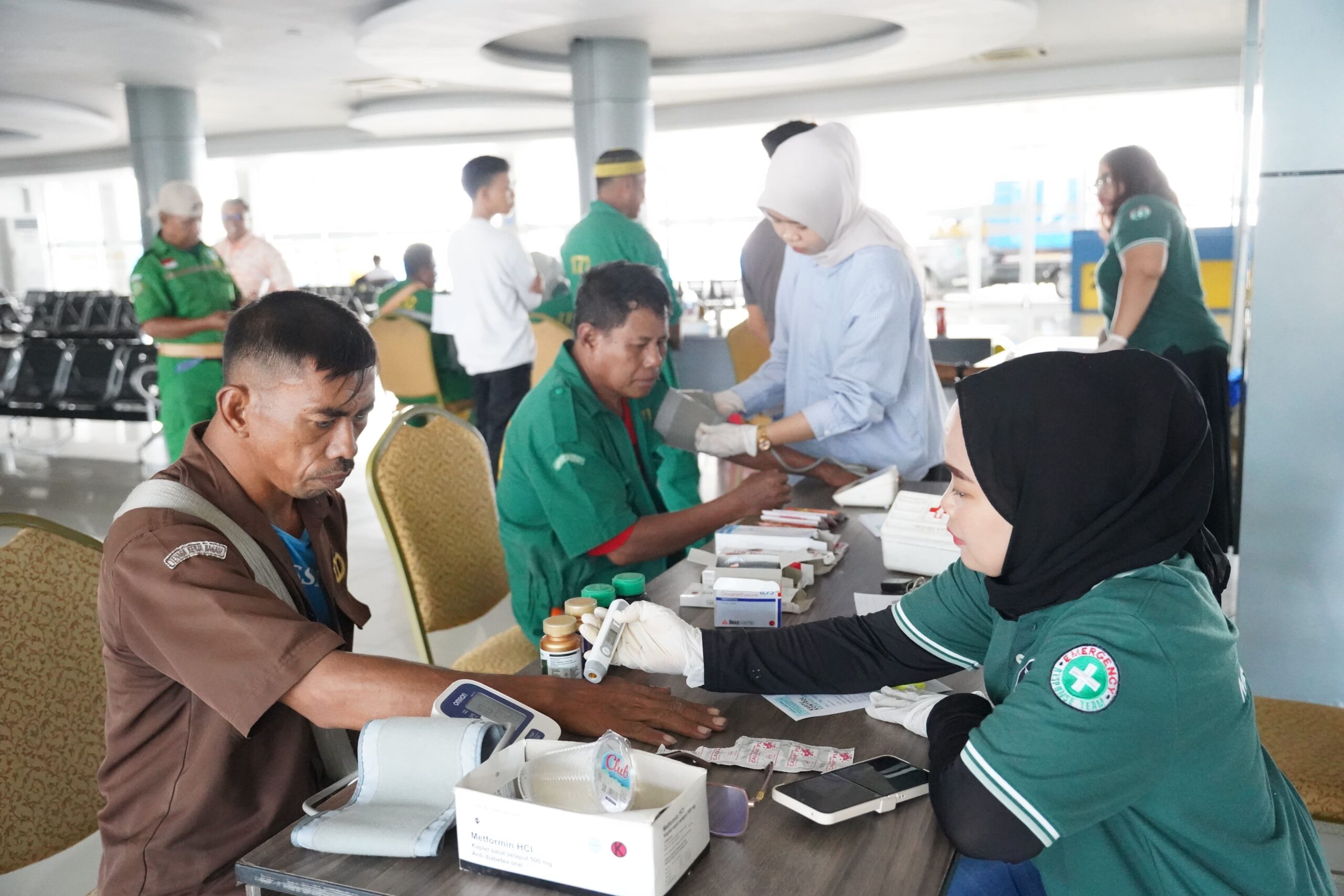 PT Pelindo (Persero) yang bergerak di bidang layanan marine, equipment, dan port services (MEPS) terus menunjukkan komitmen kepeduliannya terhadap kesehatan masyarakat dan pelaku kegiatan pelayanan di sekitar Pelabuhan dengan kembali menggelar pemeriksaan kesehatan gratis untuk Tenaga Kerja Bongkar Muat (TKBM) dan Buruh Bagasi yang bertempat di Terminal Penumpang Anging Mammiri Pelabuhan Soekarno Hatta, Makassar.