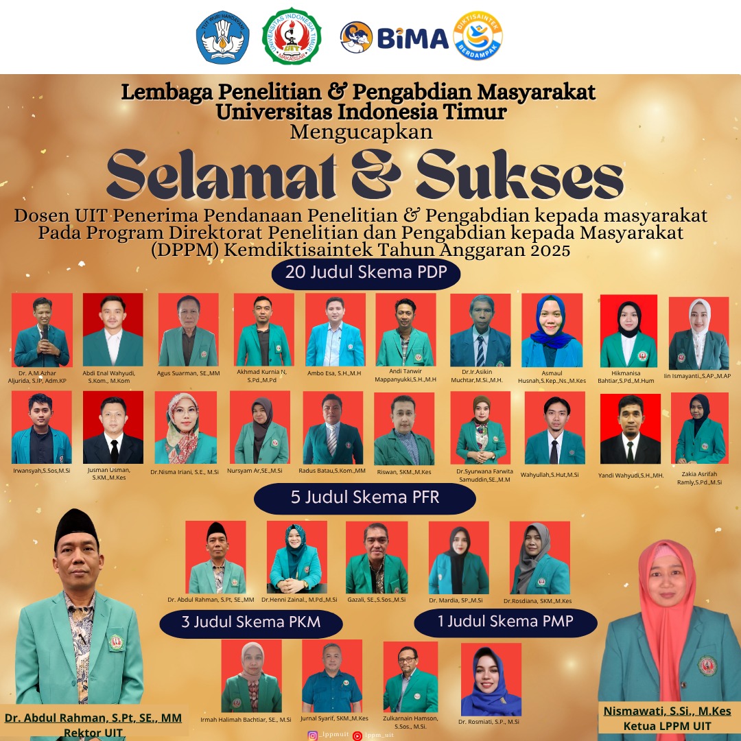 MAKASSAR,FILALIN.COM, — Universitas Indonesia Timur (UIT) Makassar mencatatkan pencapaian membanggakan di tahun 2025. Sebanyak 29 judul proposal dosen berhasil lolos pendanaan dari Direktorat Penelitian, dan Pengabdian kepada Masyarakat (DPPM) Kemditisaintek RI yang diumumkan pada tanggal 23 Mei 2025. Jumlah ini meningkat signifikan dibanding tahun-tahun sebelumnya.