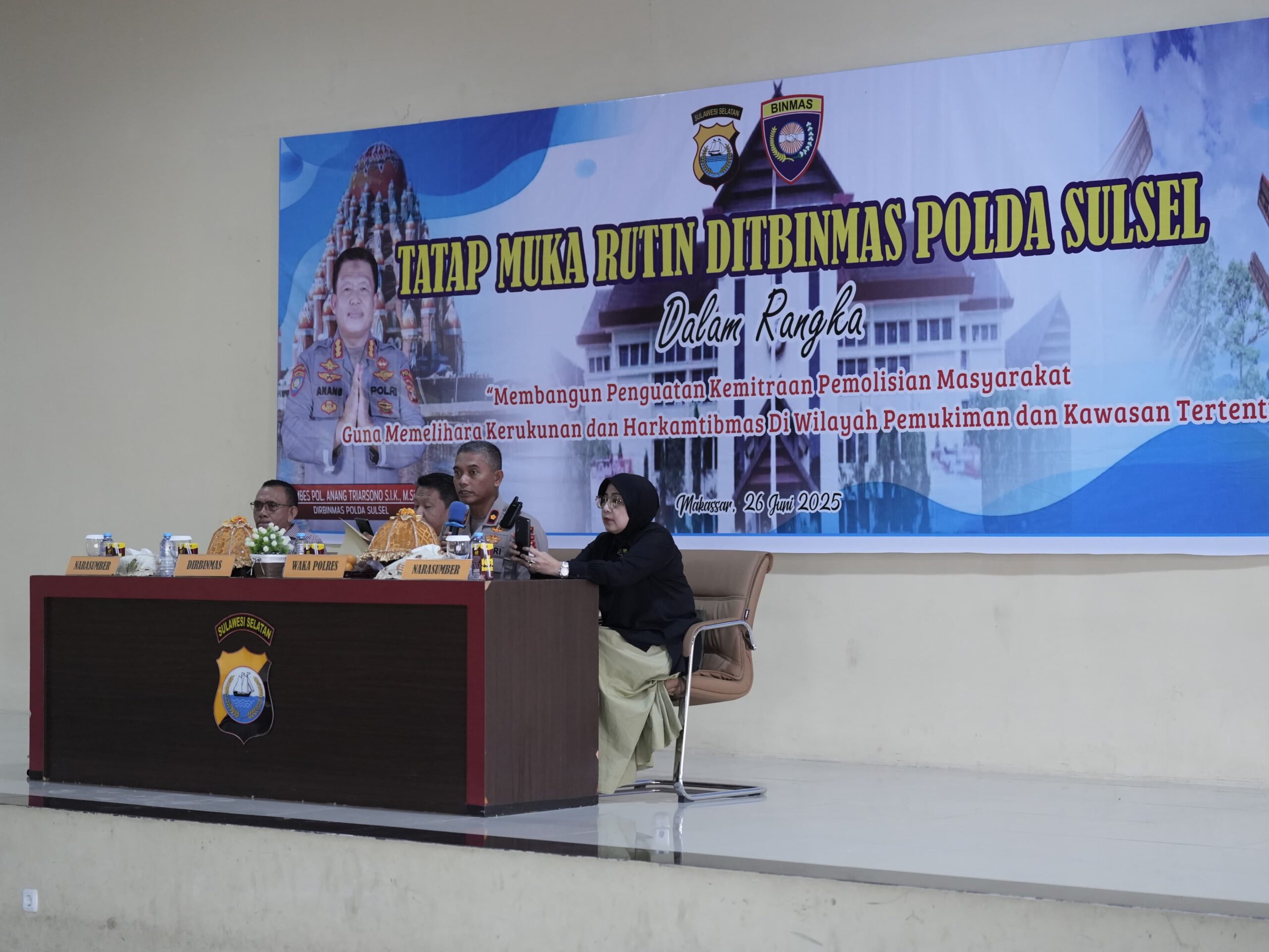 MAKASSAR,FILALIN.COM, –Dalam rangka membangun penguatan kemitraan pemolisian masyarakat guna memelihara kerukunan dan Harkamtibmas di wilayah pemukiman dan kawasan tertentu, Direktorat Binmas Polda Sulsel menggelar kegiatan tatap muka rutin di Aula Rewako Wicaksana Laghawa Polres Gowa, Kamis (26/6).
