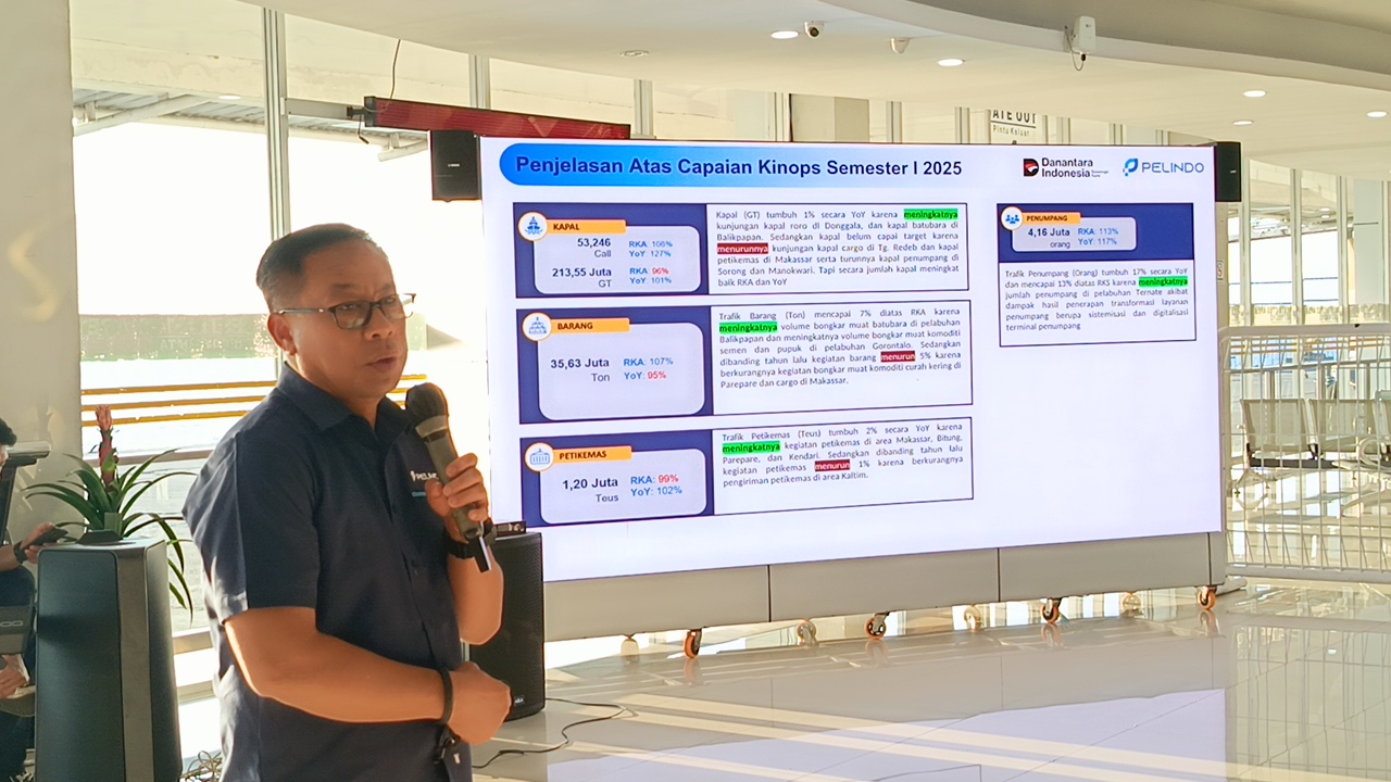 Executive Director 4 Pelindo Regional 4 menyampaikan bahwa berdasarkan data konsolidasi, arus kapal periode Januari hingga Juni 2025 tercatat mencapai 213,55 juta GT (Gross Tonnage), tumbuh 1% secara year on year (YoY).