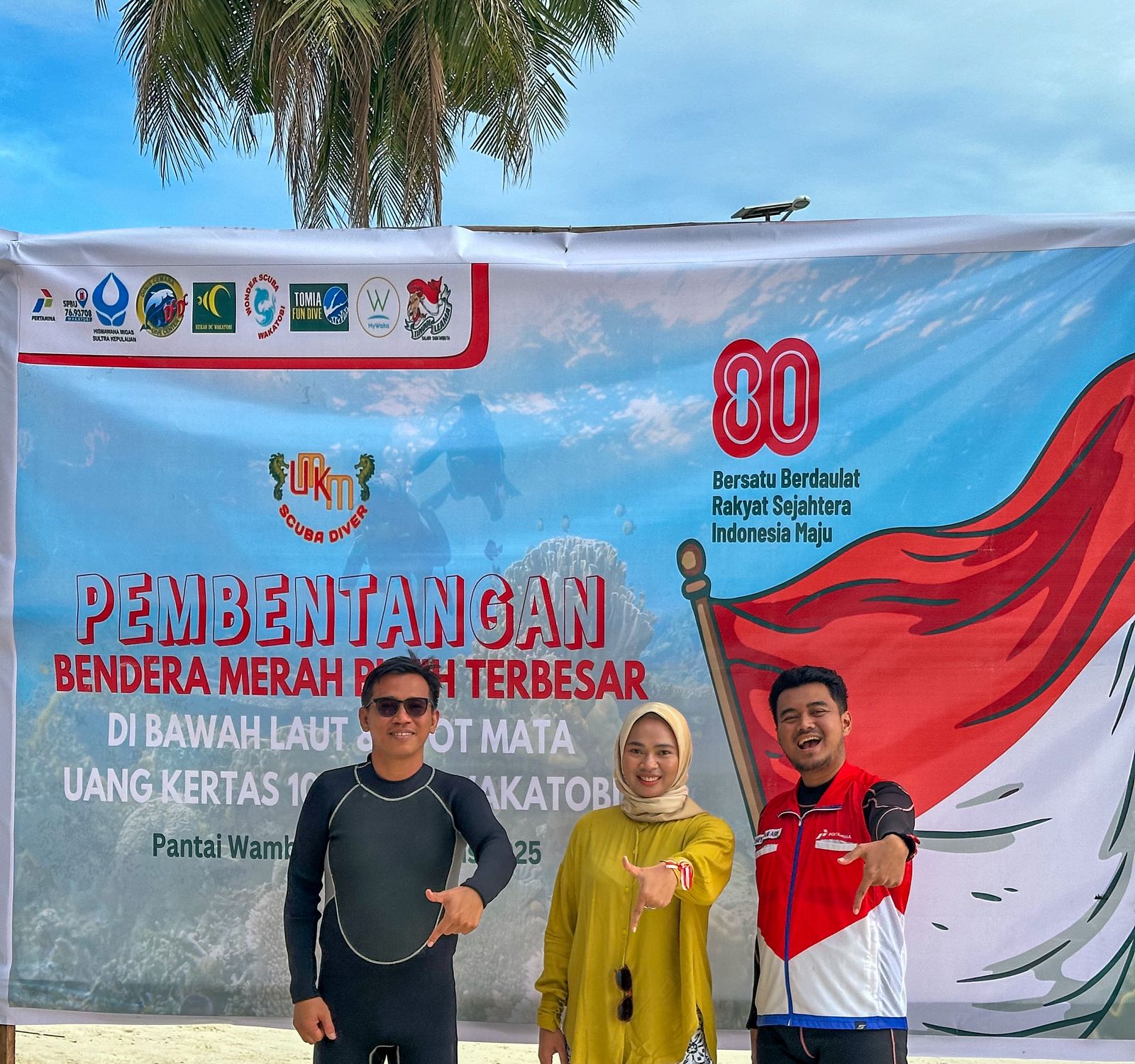 MAKASSAR,FILALIN.COM ,– Dalam semangat memperingati Hari Ulang Tahun ke-80 Republik Indonesia, momen bersejarah tercipta di bawah laut Wakatobi. Bendera Merah Putih terbesar dibentangkan di salah satu spot penyelaman paling ikonik Indonesia, yaitu “Spot Mata Uang Rp10.000” di Pantai Wamboliga, Desa Sombu, Kecamatan Wangi-Wangi, Kabupaten Wakatobi, Sulawesi Tenggara.