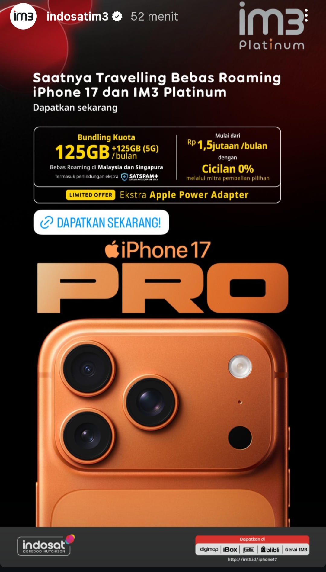 Dalam unggahan resmi akun Instagram @indosatim3, disebutkan bahwa pelanggan bisa mendapatkan iPhone 17 Pro mulai dari Rp1,5 jutaan per bulan dengan cicilan 0% serta bonus Apple Power Adapter sebagai penawaran terbatas.
