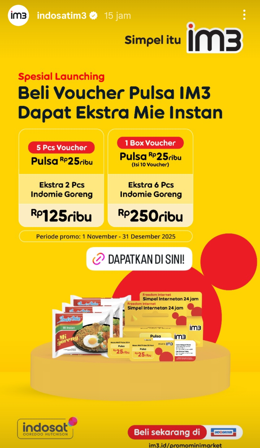 MAKASSAR,FILALIN.COM, — IM3 kembali menghadirkan penawaran menarik bagi para pelanggannya melalui promo terbaru yang diumumkan di akun Instagram resmi @indosatim3. Dalam kampanye bertajuk “Beli Voucher Pulsa IM3 Dapat Ekstra Mie Instan”, pelanggan bisa mendapatkan bonus mi instan untuk setiap pembelian voucher pulsa tertentu.