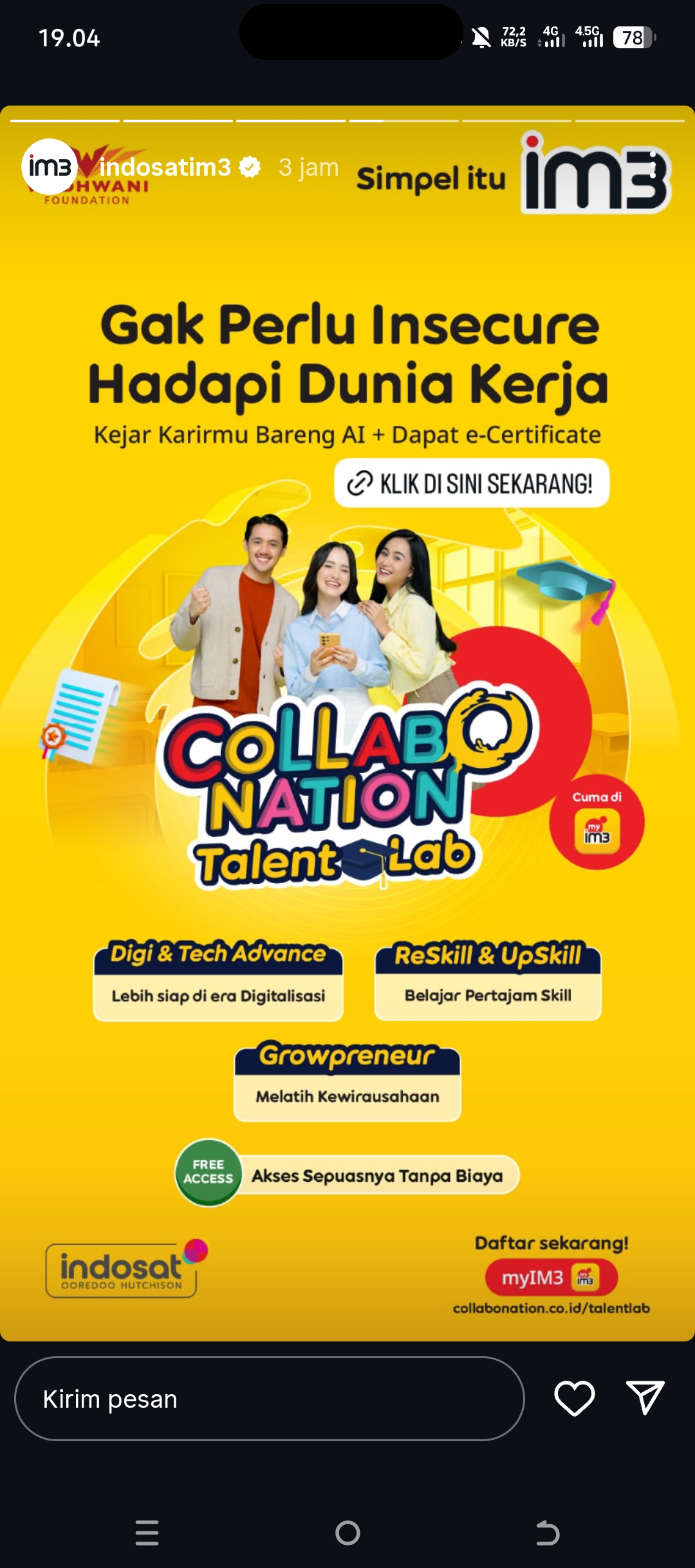 IM3 memastikan seluruh kelas dan modul dapat diakses gratis tanpa biaya melalui aplikasi myIM3 atau laman resmi collabonation.co.id/talentlab.