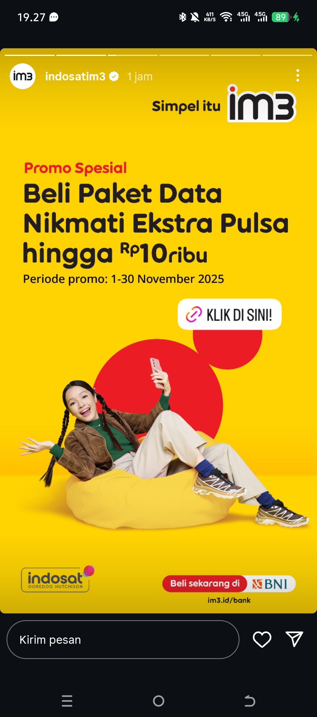 Dalam materi promosi yang ditampilkan, IM3 menonjolkan konsep kemudahan dan keseruan dalam menikmati layanan digital. Visual cerah dengan dominasi warna kuning khas IM3, serta ikon tombol “Klik di Sini”, menunjukkan kemudahan akses bagi pelanggan untuk langsung memanfaatkan promo tersebut. Promo ini juga bekerja sama dengan BNI, memungkinkan pembelian yang lebih praktis melalui kanal perbankan.