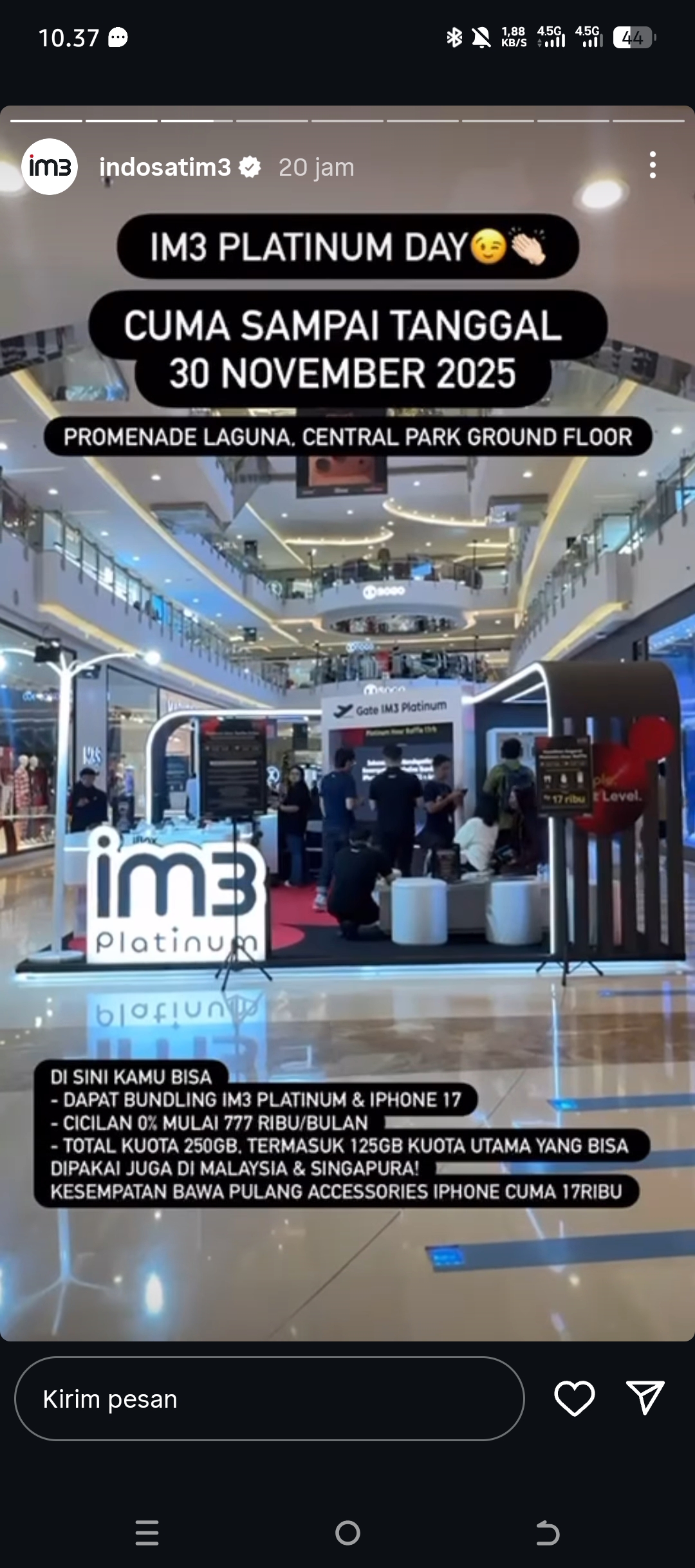 Salah satu penawaran yang paling diminati adalah bundling IM3 Platinum dengan iPhone 17, yang dapat diperoleh melalui program cicilan 0% mulai dari Rp777 ribu per bulan. Selain itu, pelanggan juga mendapatkan total kuota 250GB, termasuk 125GB kuota utama yang bisa digunakan tidak hanya di Indonesia, tetapi juga di Malaysia dan Singapura.