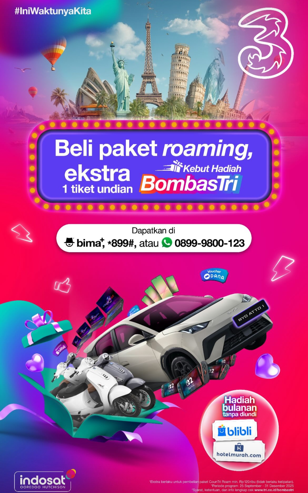 Tri Indonesia Hadirkan Program BombasTri, Beli Paket Roaming Dapat Tiket Undian Hadiah Besar
