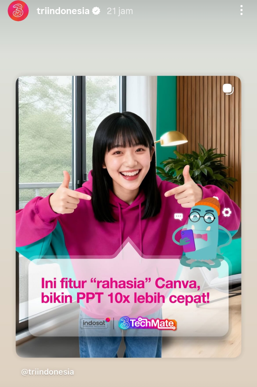 Dalam unggahan tersebut terlihat seorang perempuan muda yang tampil ceria sambil menunjuk ke arah tulisan promosi. Visual tersebut juga dilengkapi karakter ilustrasi khas TechMate, menegaskan kolaborasi antara tri Indonesia, Indosat, dan TechMate dalam memberikan tips teknologi yang bermanfaat.
