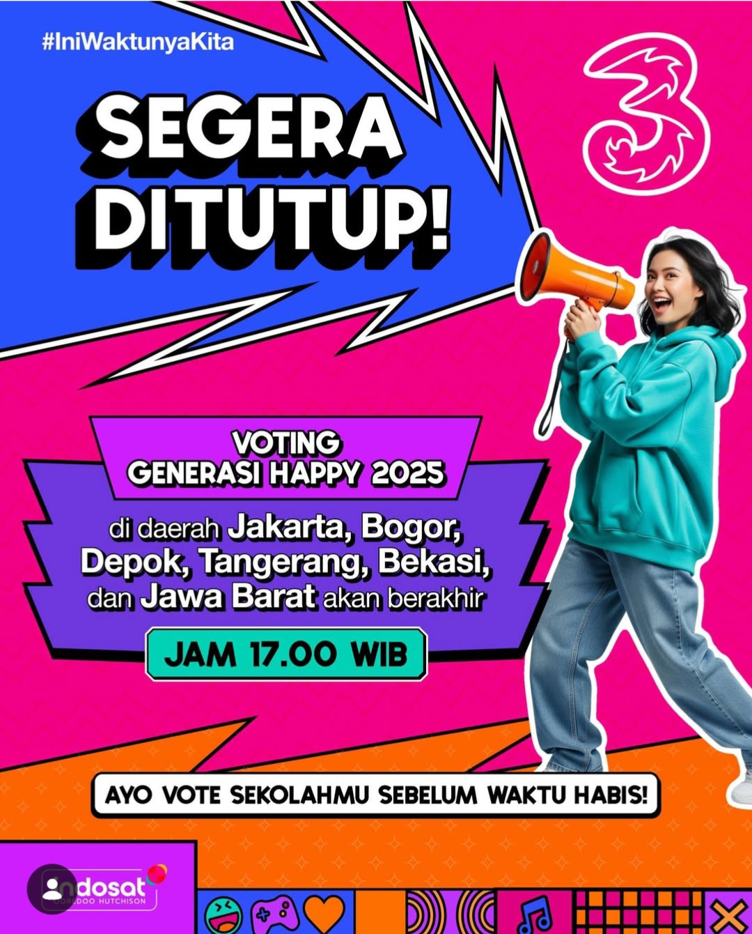 MAKASSAR,FILALIN.COM, -+Voting untuk ajang Generasi Happy 2025 yang digelar oleh Tri dan Indosat Ooredoo Hutchison memasuki batas akhir. Berdasarkan informasi pada materi publikasi resmi, proses pemungutan suara untuk wilayah Jakarta, Bogor, Depok, Tangerang, Bekasi, dan Jawa Barat akan resmi ditutup pada pukul 17.00 WIB.