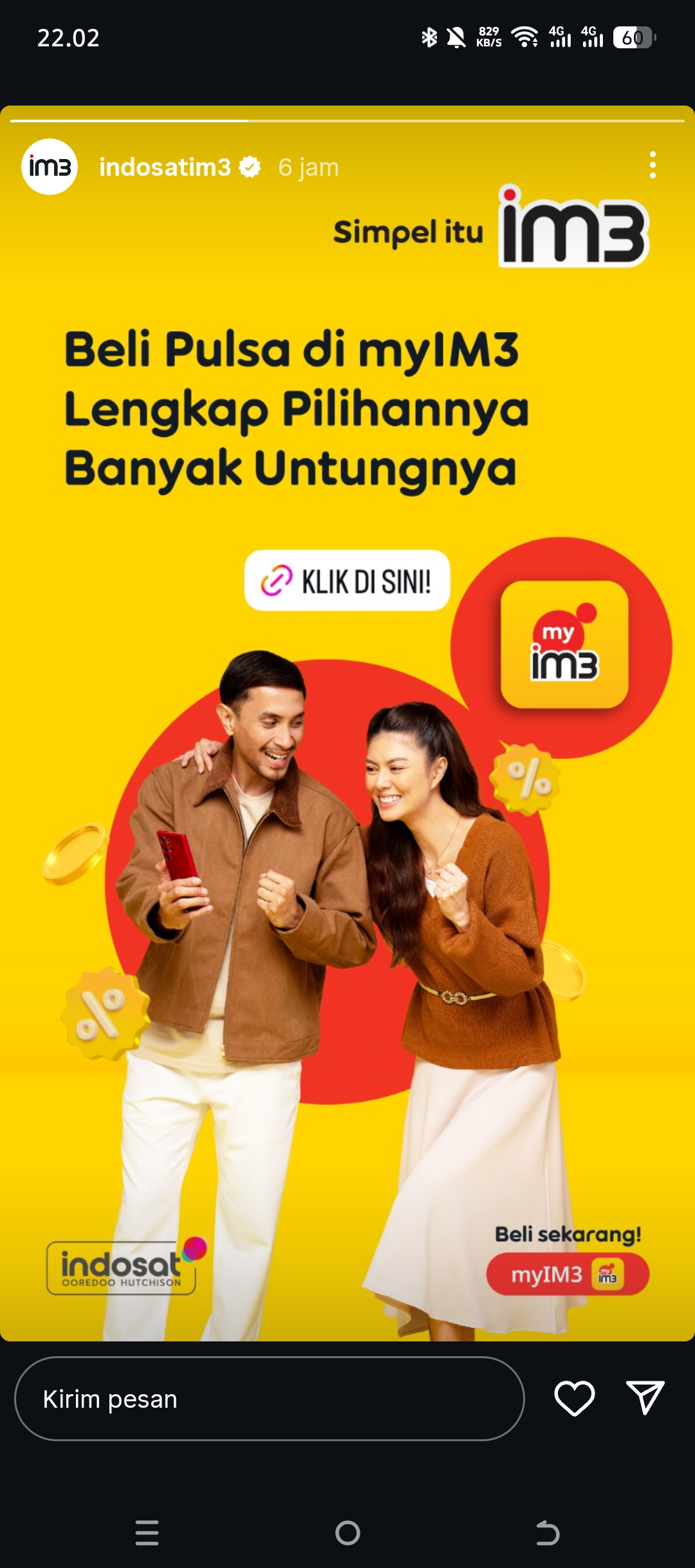 Dalam materi promosi tersebut, IM3 menonjolkan kenyamanan pengguna dalam melakukan transaksi hanya melalui ponsel. Dua model yang tampak antusias menunjukkan pengalaman positif saat mengakses aplikasi myIM3, memperkuat pesan bahwa layanan digital ini dirancang untuk cepat, mudah, dan aman.