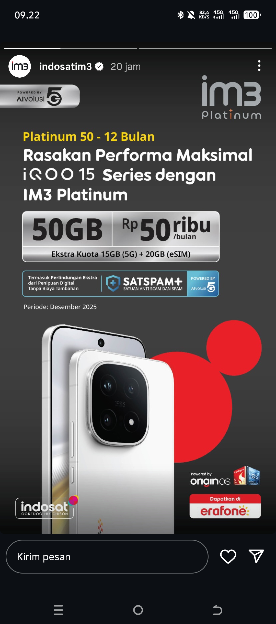 Program kolaborasi antara IM3 dan iQOO ini berlangsung selama periode Desember 2025, dan pelanggan dapat memperoleh paket serta perangkat iQOO di gerai Erafone yang menjadi mitra resmi penjualan.