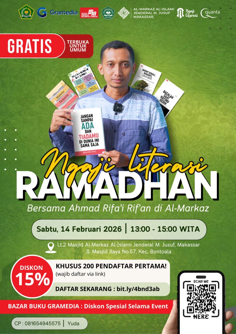 MAKASSAR,FILALIN.COM, –Penulis nasional best seller Ahmad Rifa’i Rif’an dijadwalkan mengisi kegiatan Book Talk bertajuk Ngaji Literasi pada Sabtu, 14 Februari 2026 di Masjid Al-Markaz Al-Islami Jend. M. Jusuf.