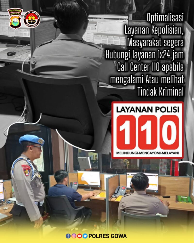 GOWA,FILALIN.COM, –Dalam upaya meningkatkan pelayanan kepada masyarakat serta menjaga situasi keamanan dan ketertiban tetap kondusif, Polres Gowa terus mengoptimalkan layanan kepolisian melalui Call Center 110 yang siap melayani masyarakat selama 1×24 jam, Jum’at (3/4/2026).