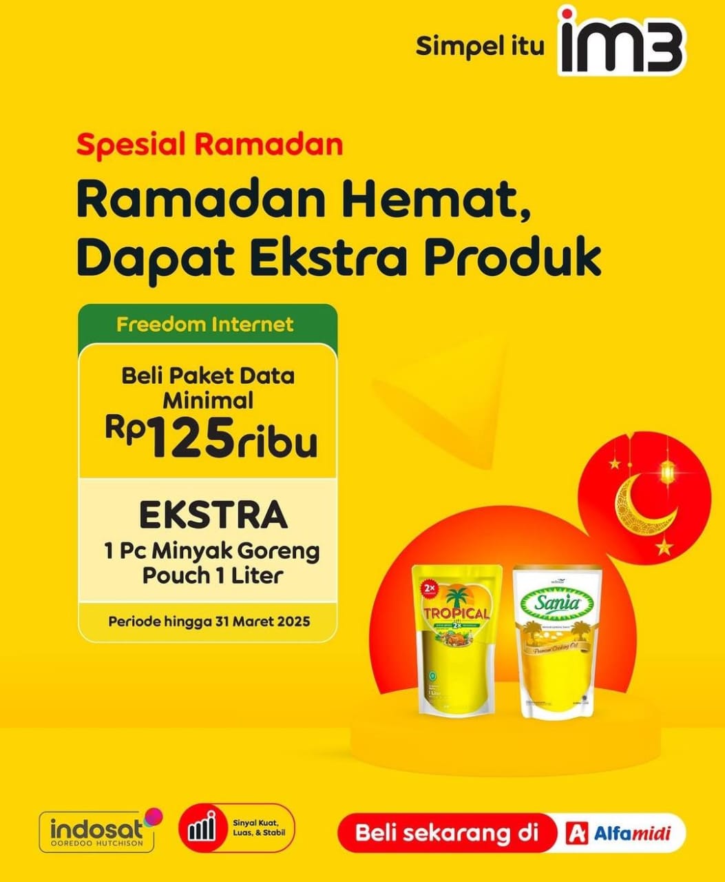 Indosat Ooredoo Hutchison (IM3) menghadirkan promo menarik bagi pelanggannya, yaitu setiap pembelian kuota tertentu akan mendapatkan minyak goreng gratis. Promo ini berlaku di beberapa daerah dan berlangsung dalam periode terbatas. Khusus pembelian paket data dengan ekstra berkah, berupa paket Freedom Internet dengan membeli paket data minimal Rp 125 ribu, akan berhadiah gratis 1 pc minyak goreng pouch 1 liter dengan brand terkenal. Penawaran menarik ini hanya berlaku hingga tanggal 31 maret 2025.Langkah ini mendapat sambutan positif dari masyarakat, terutama di tengah naiknya harga kebutuhan pokok.