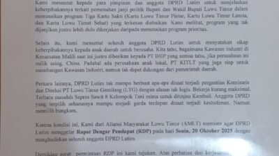 LUWUTIMUR,FILALIN.COM, Aliansi Masyarakat Luwu Timur (AMLT) mendesak Dewan Perwakilan Rakyat Daerah (DPRD) Kabupaten Luwu Timur…